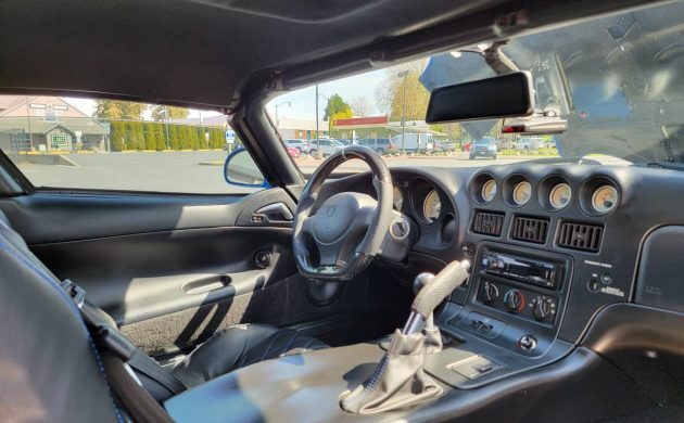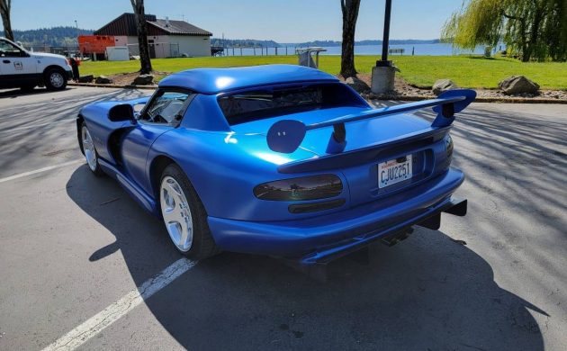 Now, listen: to each their own, and live and let live. Those are important epitaphs to remember when looking at a car that has clearly been personalized. The trouble is the seller doesn’t tell us much about the aero enhancements, and I genuinely wonder if they have some purpose beyond purely cosmetic. The Viper is often used as a track car despite its straight line speed, and the aggressive front air dam, rear wing, and rear apron diffuser could actually be purposeful upgrades. The seller doesn’t confirm, however, that this Viper was a track day build, and the blacked out taillights seem to suggest otherwise. It’s nice to see the factory roof panel in place, however.