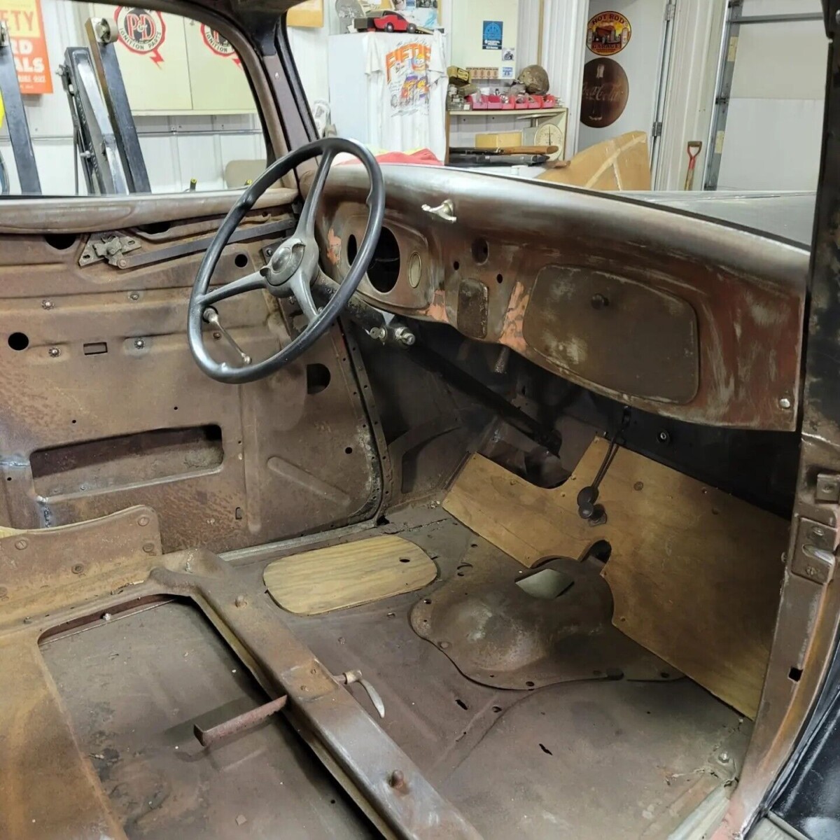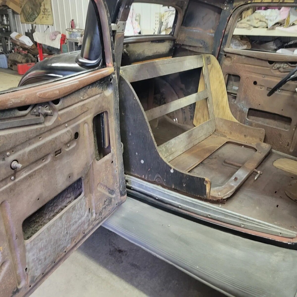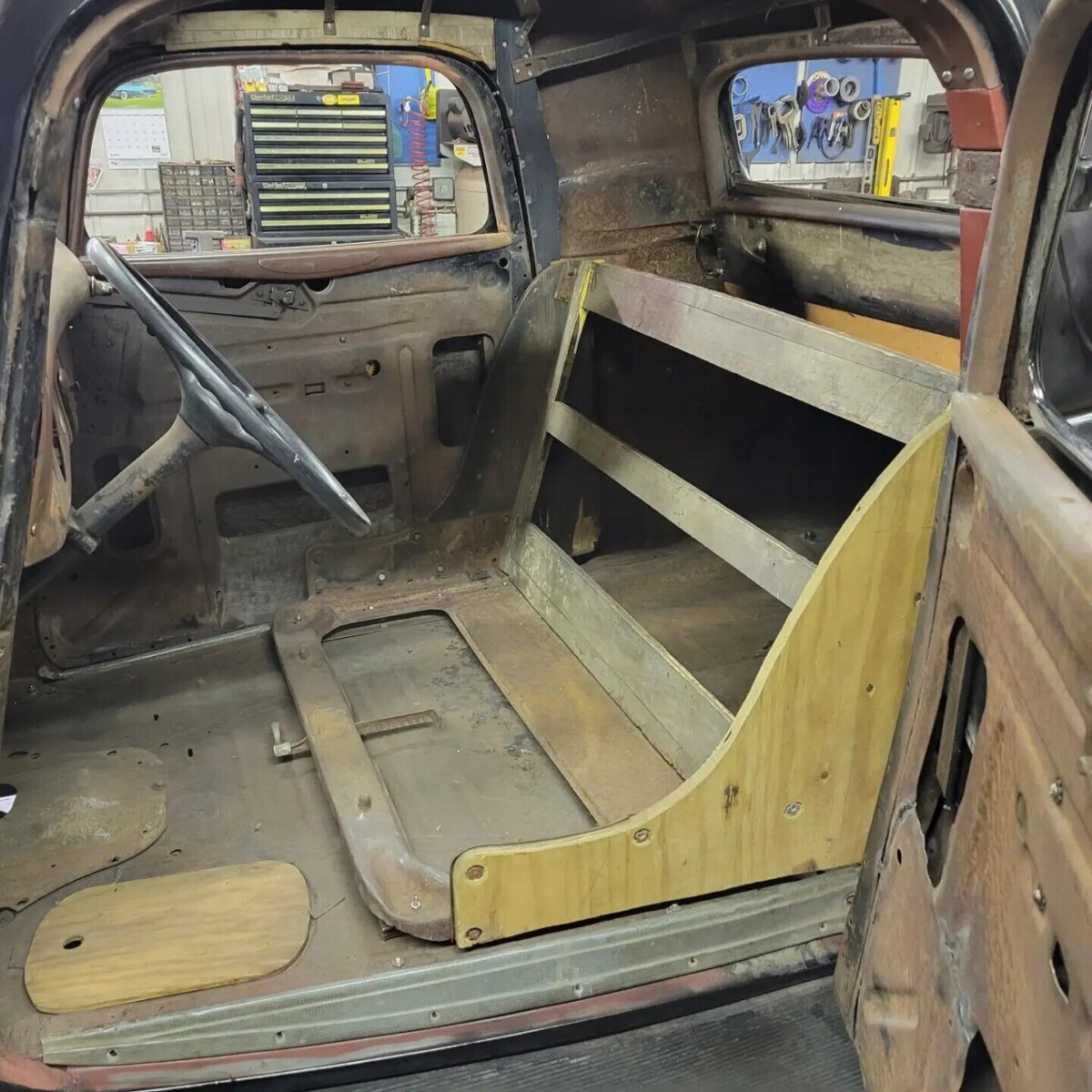 The engine and transmission are absent (supporting the hot rod intentions), and some parts are off the car. There is new glass and glass channels and a header panel. The front and rear suspension are stock, and the grille shell is the uncrumpled original. There’s a rumble seat!