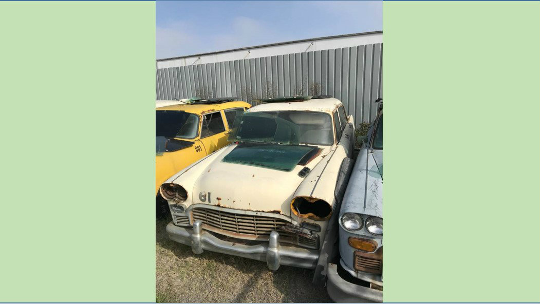 It looks like #157 and #61 below came from the same cab company based on the color and numbering scheme. Due to the dips in the front bumpers and the lack of side marker lights, by looking over this guide I can see that they date from 1962-1968. The seller tells us that none of these cars are complete, and I think I’d be looking at picking up all four if I were serious about putting any of them back on the road.