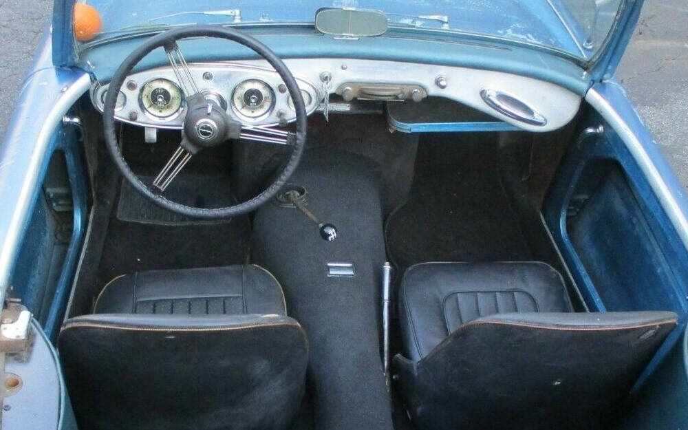 The seller says this is one of the lowest mileage, straightest, and most rust-free Austin-Healey vehicles he has ever owned. The current owner purchased the car from an Arizona seller in 1993, and it recently came out of a long-time inside hibernation for recommissioning and work to make it road-worthy. The body panels are said to be all original, with excellent alignment and gaps. The original color was Healey Blue, although it has been repainted in a slightly different shade of blue with white down below.