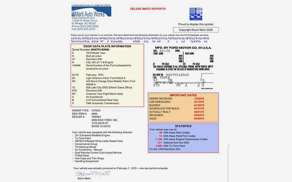 Most of us have heard of Marti Reports in regard to Ford vehicles, but some of us may not know the story behind this company, including its founder, Kevin Marti. It’s interesting, and this rust-free 1979 Ford Ranchero 500 has a Marti Report as part of the seller’s photo gallery. They have this LTD II-based Ranchero posted here on craigslist in beautiful Northeast Phoenix, Arizona, and they’re asking $7,500. Here is the original listing, and thanks to Rocco B. for the tip!