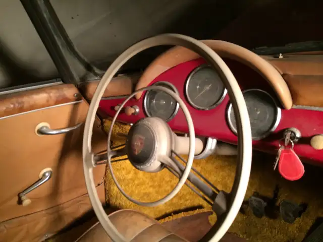 This has a nice aged “survivor” look that many people love, but many also hate! It isn’t as original as it first appears, though. The wheels (and aluminum brake drums) were painted body color, which makes me believe that this car received a repaint in the past. Many cheaper paint shops also painted wheels to match the body for some unknown reason. The wheels should be silver. There is also a 356B hood handle (not the slimmer 356A type). It also has the coachbuilder (Drauz) badge on the wrong side of the car. I have owned my Convertible D ever since I was 16 – traded a ’64 Datsun pickup for it!