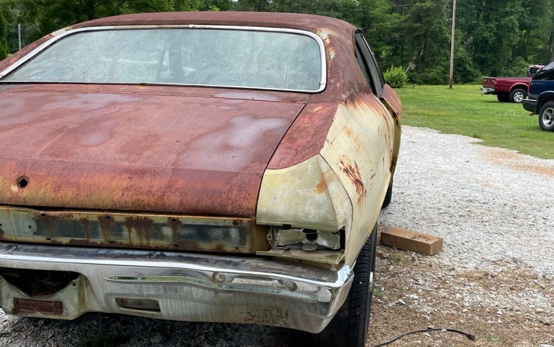 OK, so this Chevelle is missing a few parts, actually, it’s missing lots of stuff including the fenders, inner fenders, hood, valance, radiator and bulkhead, grille, bumper, brackets, lights, and that’s just the immediately noticeable items. The seller adds that this Chevelle also will need a trunk pan but the floors are fair and the frame is “awesome” (I wouldn’t go that far). What is here, such as the quarters, are not without their issues either. Additionally, the taillights are missing, as is the rear trim panel and the back bumper is less than straight.