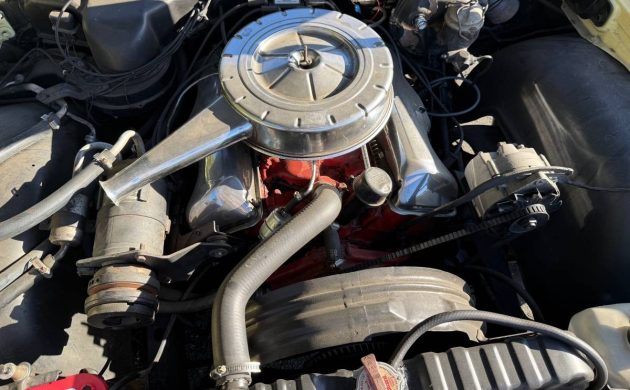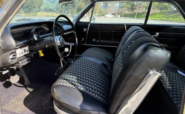 Since this is a non-SS model, it is equipped with a bench seat, and the upholstery is in fine nick – as are the door panels. Ditto the carpet; black nylon loop has a tendency to fade to brown with age, so I’ll assume the rug has been replaced. One nice feature is the factory tachometer – it’s a necessary option as this Impala is equipped with a four-speed manual transmission, though that’s not stated anywhere in the listing – a big time omission! Of course, it’s a non-working tach, so as it is, its value is limited. A/C is also on tap, but it’s in the same operational mode as the tachometer.