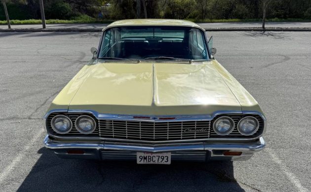 We’ve covered many 1964 full-size Chevrolets here on BF, and why not? The bowtie had the tiger by the tail in ’64, knocking out 2.1 M 1.6 M full-size (B-body) cars. The standard Impala, not including the separate series Super Sport (SS) model, accounted for 690K of that total. Even if only 5% (34,500 units) are still in existence, that’s a lot of cars that can still be covered. Since I already gave away the engine biz, I’ll suggest that about 8,700 B-bodies were powered by one of three different 409 CI engines. Initial observations: The finish looks good – it may or may not be a repaint, there’s no apparent indication of rust or panel damage, the stainless steel side moldings look as if they’ve encountered some parking lot friction (dings), and the suspension has either been lowered or this baby is sittin’ on some very tired coil springs. I’m generally not a fan of wire wheel covers, but I must say, in this instance, they work well.