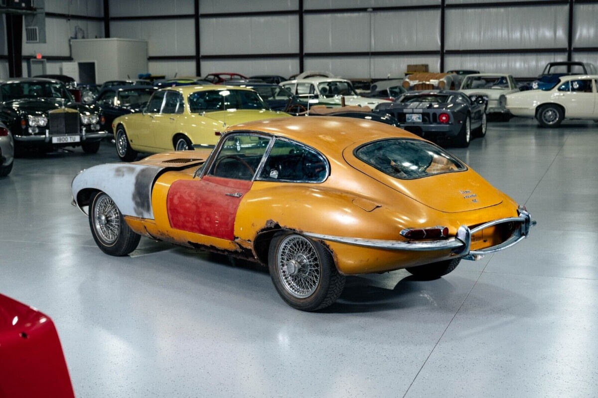 You have to love the mismatched body panel colors, which suggests that this Jaguar was just another used car at one point in time, with previous owners simply trying to bolt it back together after an accident or rust damage set in. The original color is a very striking shade known as Opalescent Golden Sand, which is effectively tan but is still a color we don’t often see on the racy E-Type, which is almost always painted red, or black, or British Racing Green. I was somewhat excited that the burnt orange paint on the car’s hindquarters was possibly original, as it looks pretty sharp on those fat fenders (it is not). The Jaguar appears to retain its original wire wheels, at least.