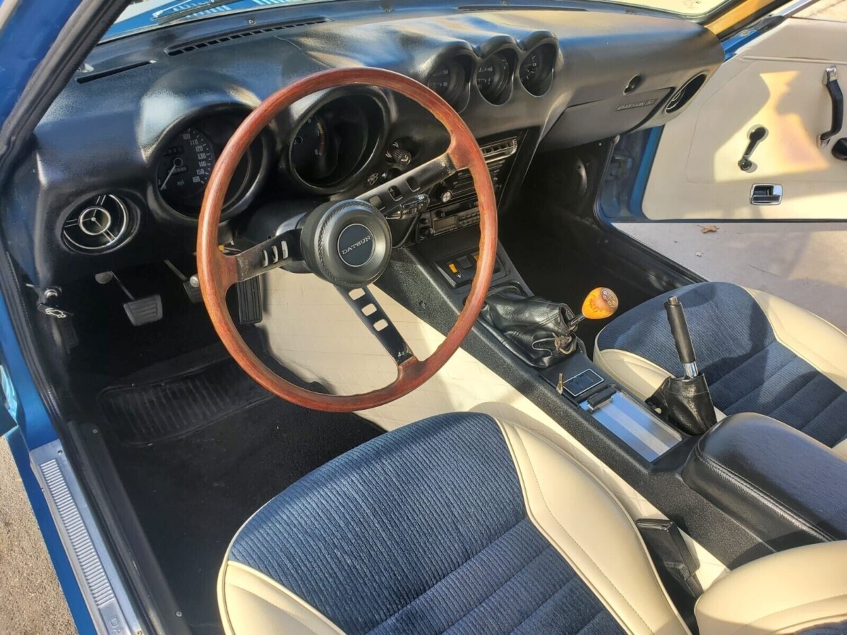 I had two 1971 Zs, a blue one like this and a silver one. It probably is a 1972. . . . The hubcaps are 72s, the gas door does not have a lock and the interior controls look like 72s. If it had a blue interior, it was almost a metallic blue vinyl. It needed to be redone!! You are right about the interior angliagt, I don’t like it either.