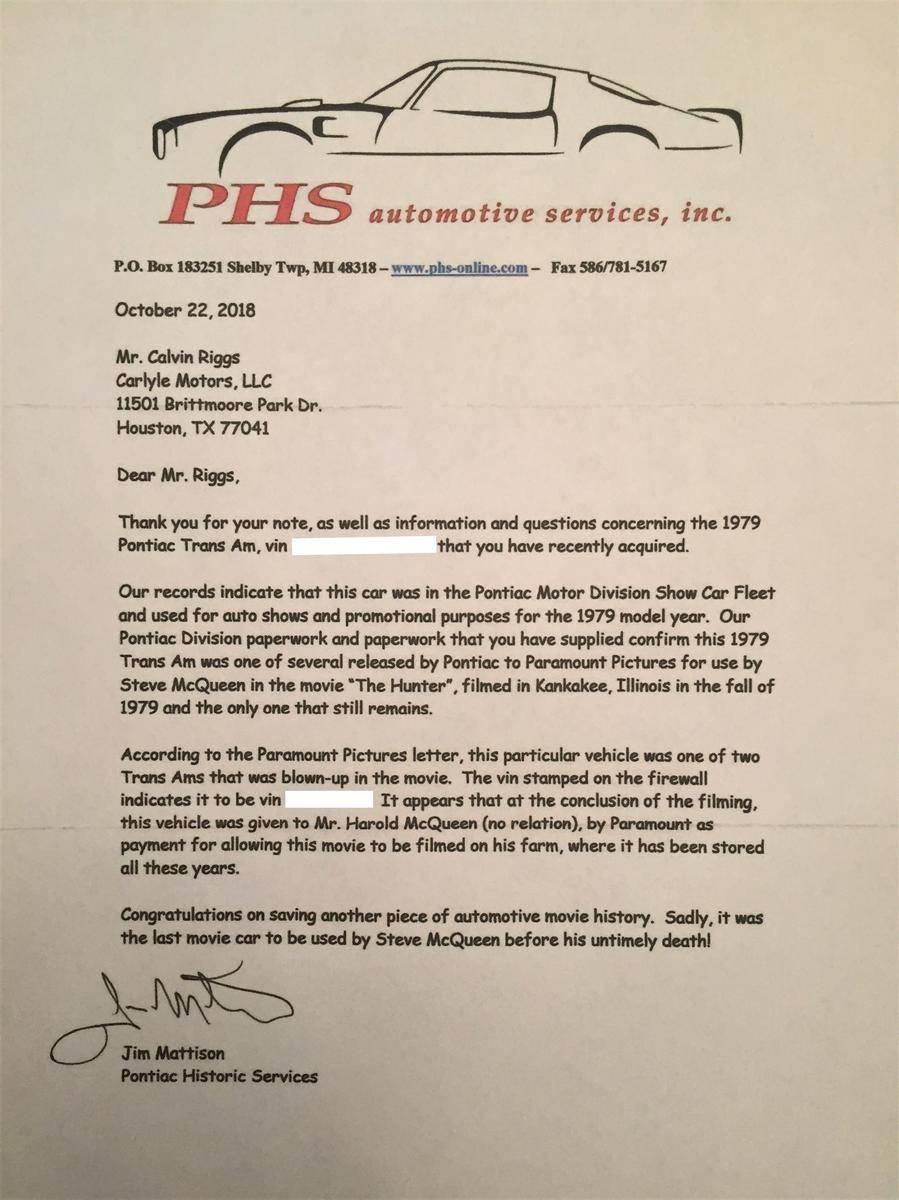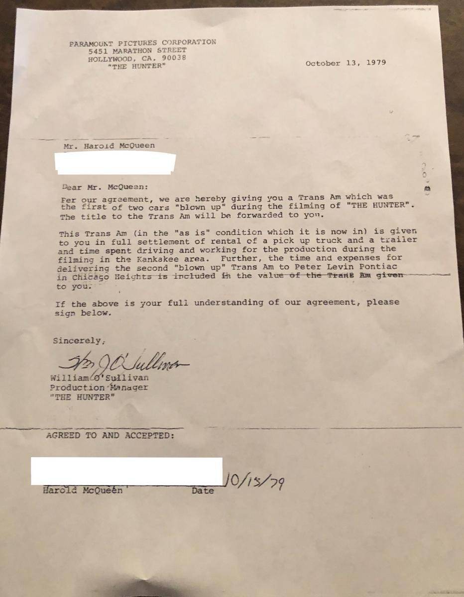 The car that was used in the first take is the car that you see here. Originally finished in Nocturne Blue, Paramount had it repainted in black for the movie. Evidence of this is visible in several spots on the car. Following the conclusion of filming, Paramount gave the car and title to a gentleman by the name of Harold McQueen (no relation to Steve) as payment for him towing the remains of the first car to a workshop to have its roll-cage transferred to the second stunt car. Mr. McQueen’s truck and trailer were also used in a scene in the movie, where the second Trans Am is towed to the car rental company from where Steve McQueen’s character had rented it.