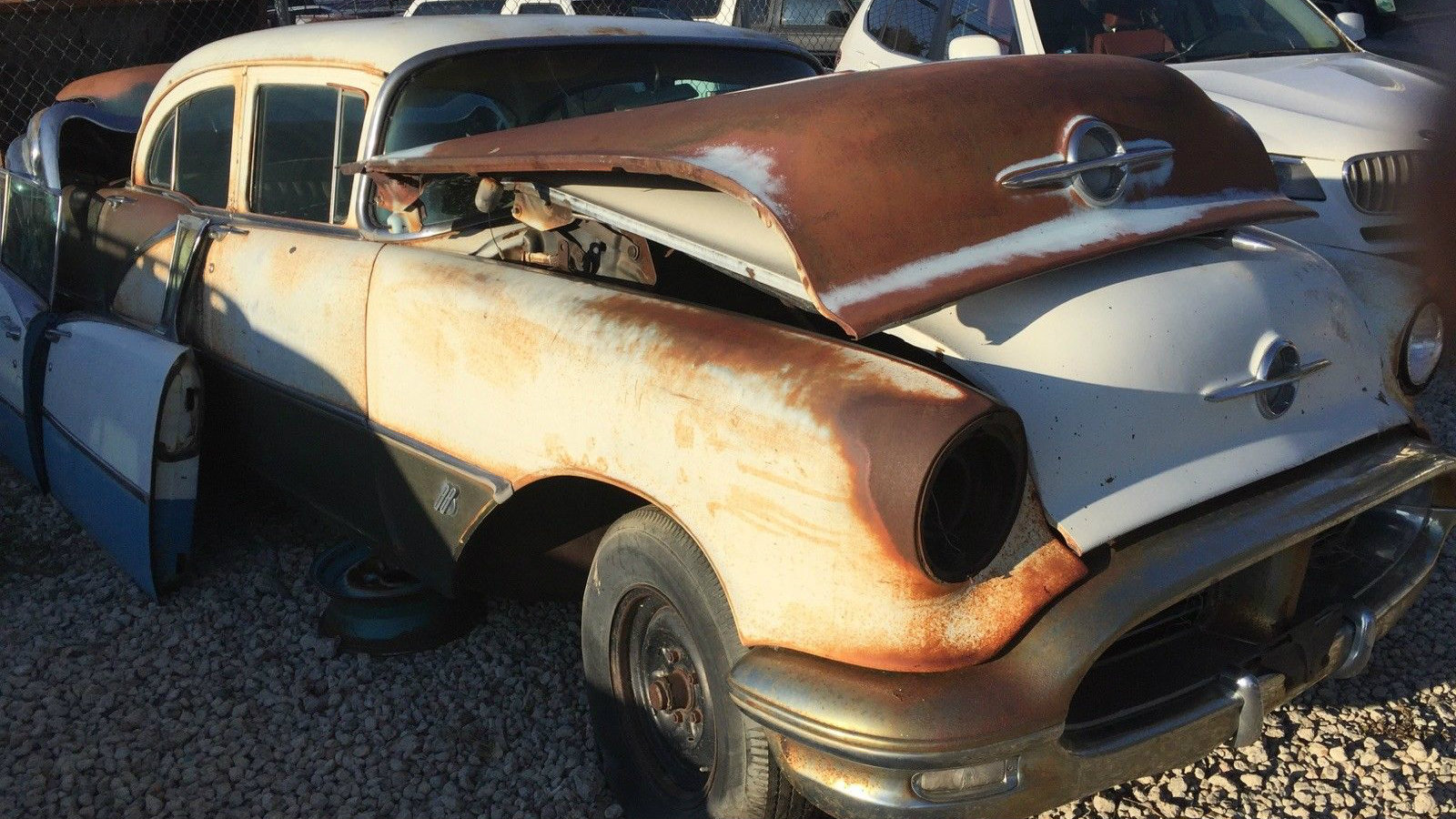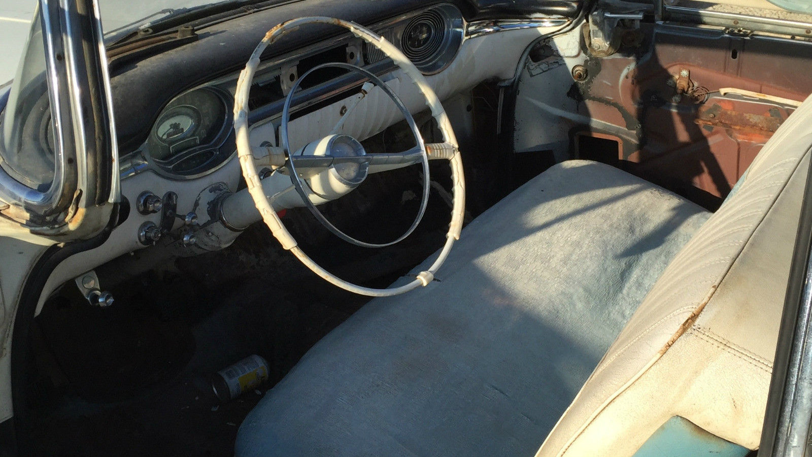 My Mom had a ’56 that thought was cool. ( I was about 9 at the time) 2 tone blue. At the same time my Grandmother had a ’55 that my Father had found for her. It was a tad bit rusty ( we lived in the Chicago area at the time) but it had belonged to a hot rodder previously and had a hot cam, dual exhaust and later model modified heads. I remember going for a ride with my Father after he tuned it up. And watching the speedo roll smoothly past 100. I was very impressed. About 6 years later my Grandmother came to visit and complained about the exhaust falling down and dragging on the street. My Father went out to look and came back in with a pale face and declared that we were going to find her a different car that day. ( ended up being a 1959 Impala). My Father then explained that it was not the exhaust dragging it was the gas tank. The only thing holding it to the car was the fuel line and fuel gauge wire! The rotted trunk floor was still attached to the tank however.