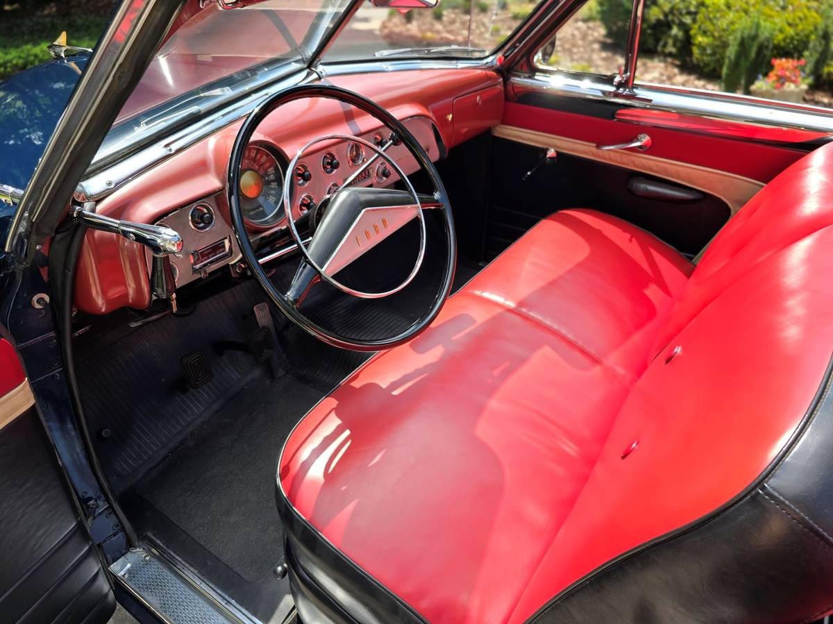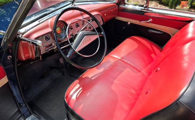 A very nice car to be sure, but IMHO that bright red interior doesn’t go with the handsome dark blue exterior. I’d have preferred a light blue and white or all white inside, maybe a white top as well.