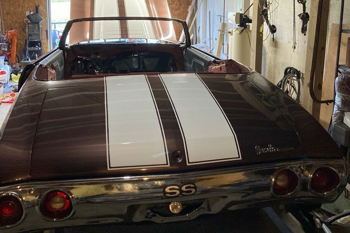 It is hard to know where to start with this Chevelle because there’s so much to absorb and appreciate. The first thing to note is that the owner has performed this restoration without resorting to reproduction parts. Virtually everything is either original, NOS, or restored. It appears that he approached this as a frame-off process that has left no stone unturned. The frame was media-blasted and powder-coated before being reattached to the body using fresh bushes. It was then undercoated so that rust should not be a problem in the future. The bodyshell is rust-free, and the owner stripped it before applying the factory-correct red oxide primer. Over this has been laid the beautiful original shade of Rosewood Metallic with the White stripes. His attention to detail extends to every aspect of the car. Many original plated components have been restored and replated, including the hood hinges, hood lock mechanism, and brake booster. If it were plated originally, a coat of paint would not suffice. Even the original wheels didn’t escape this meticulous approach. They have been restored to their original appearance down to the correct gray on the back, and a set of NOS brushed trim rings and blue center caps. It appears that the buyer will be left with the final assembly, which will include fitting bumpers and other hardware, the new power top, and installing the glass and weather stripping.