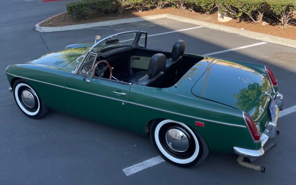 Finished in typical British racing green, this roadster is certainly no rust bucket, a common fate that befalls this vintage MG. The small hubcaps and white stripe tires give this car an innocent 1969 look. The finish is still sound and the body panels are nice and straight. While it’s nice to see a B’s front end that hasn’t misjudged a fixed object’s position. Unfortunately, the front edge of the hood looks like it encountered a rather large bee-hind that has left its very visible imprimatur.