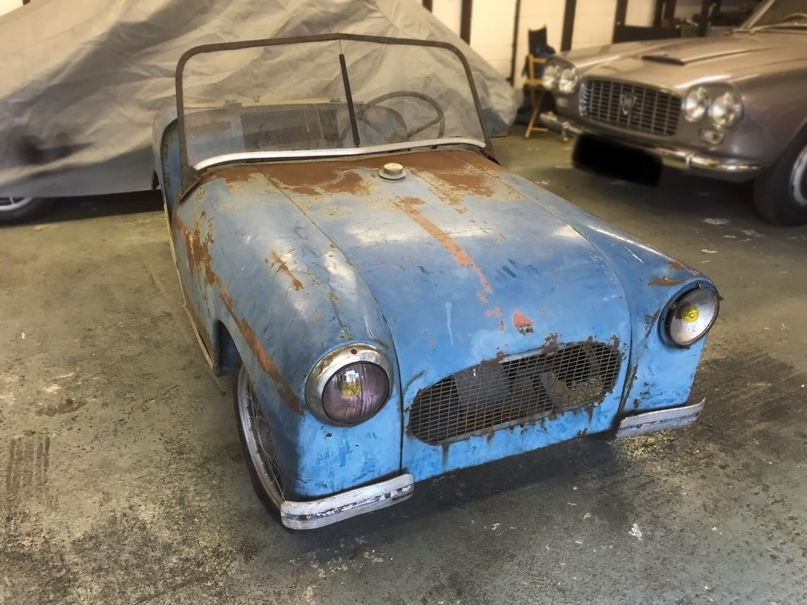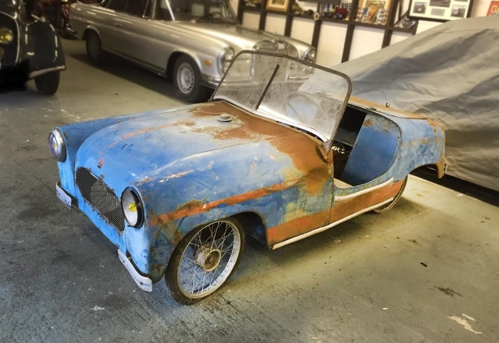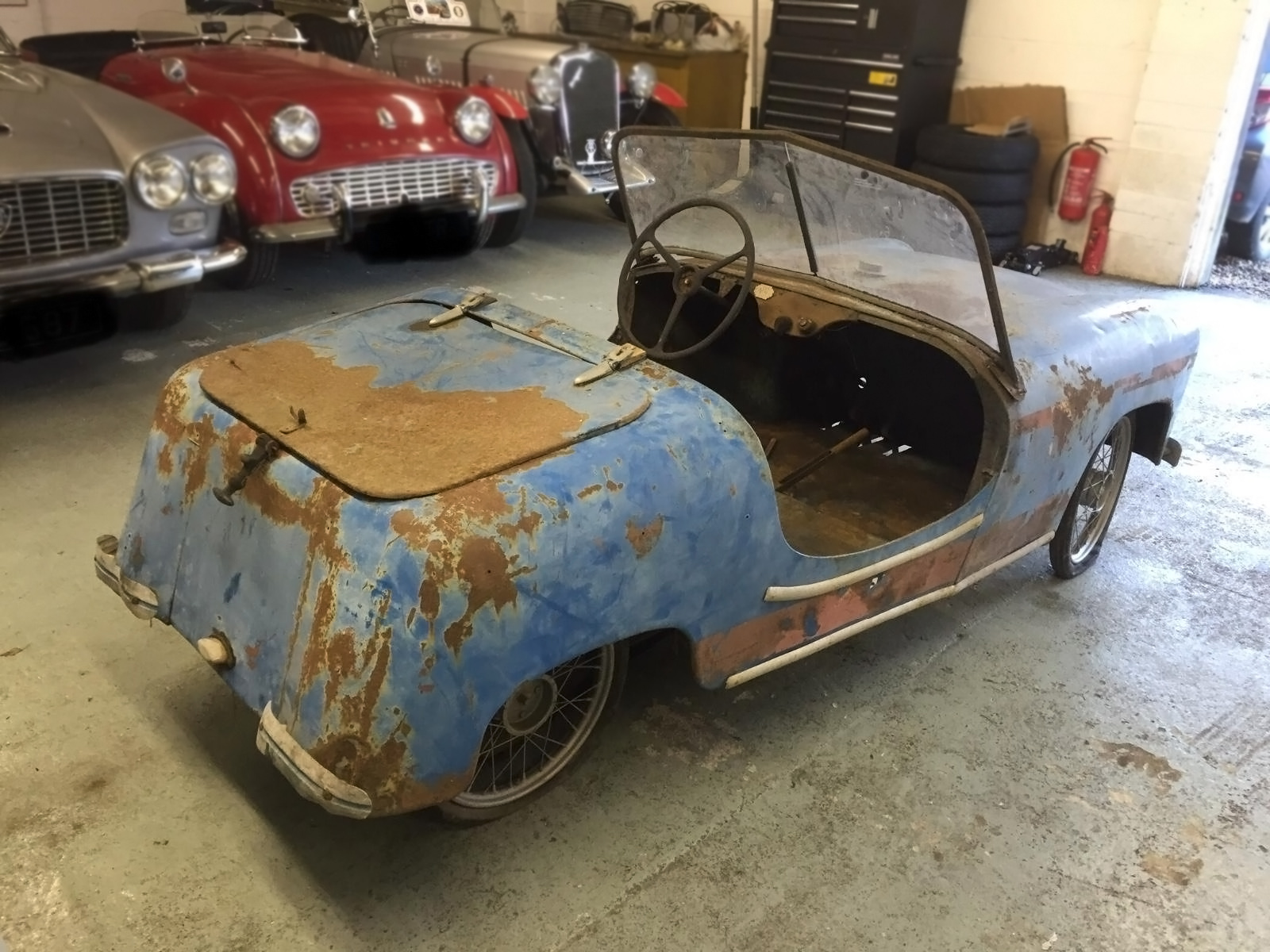 As you can tell this example needs a lot of help but at around 8-feet in length it shouldn’t take up too much room in your garage as you restore it. They don’t come up for sale too often but they have sold for $20,000+ in the past in restored condition. You can see the bicycle-like wheels and within a couple of years they would have disc wheels.
