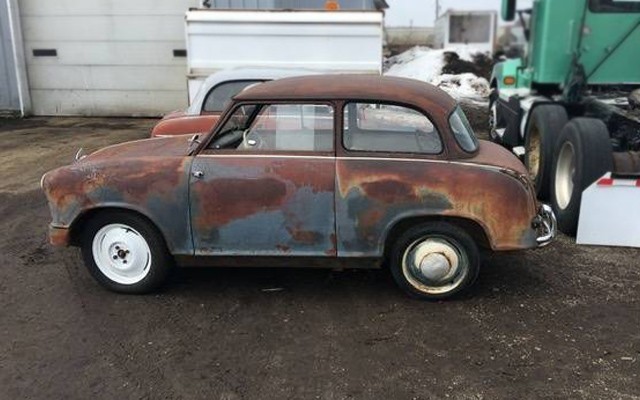 You can see the trunk on the TS, and also the TS badge on the back of the red car. I believe that the other two Lloyd cars for sale here are base Lloyd 600s, as opposed to the slightly-upgraded Lloyd Alexander (which had trunks) or the Lloyd Alexandra TS with a rounded grille and other upgrades like a 4-speed instead of a 3-speed manual. It’s hard to tell the condition of these cars, rust-wise, but you can see that at least one of them has heavy surface rust on the body. I’d be worried about the underside especially if they have been Wisconsin cars for a few decades.