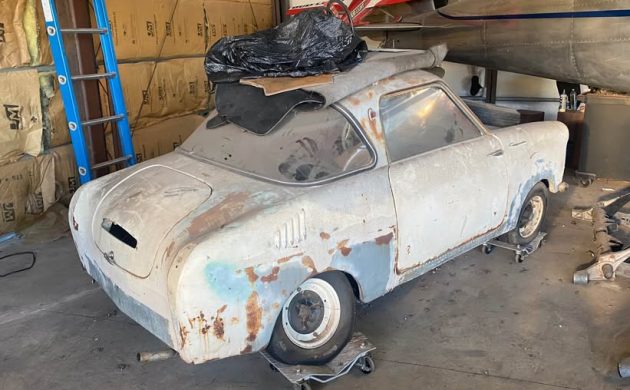 This Goggomobile is hitching a ride on a forklift as the seller sets it up for its photo shoot. The little coupe weighs less than 1000 lbs, and it represents the resurgence of post-war Europe as consumers moved off scooters and began to buy cars. Its predecessor, the T250 sedan, was launched in 1955 – the first microcar offering from the Dingolfing factory of Hans Glas. The “TS” was introduced in 1957, but alas, the “S” does not stand for “sport”, which might imply more oomph than provided by the T250’s 14 hp. No, the output was the same, but buyers could now opt for a coupe body style. Some 285,000 of these tiny troopers and their various siblings were produced, but survivors of any type are hard to find. This 1960 Goggomobile has been hanging out in hangars for most of its life, first in California for several years, then in Kansas City, Missouri for another 20 years. It’s listed for sale here on facebook Marketplace at a price of $6500. Thanks to Zappenduster for the tip!