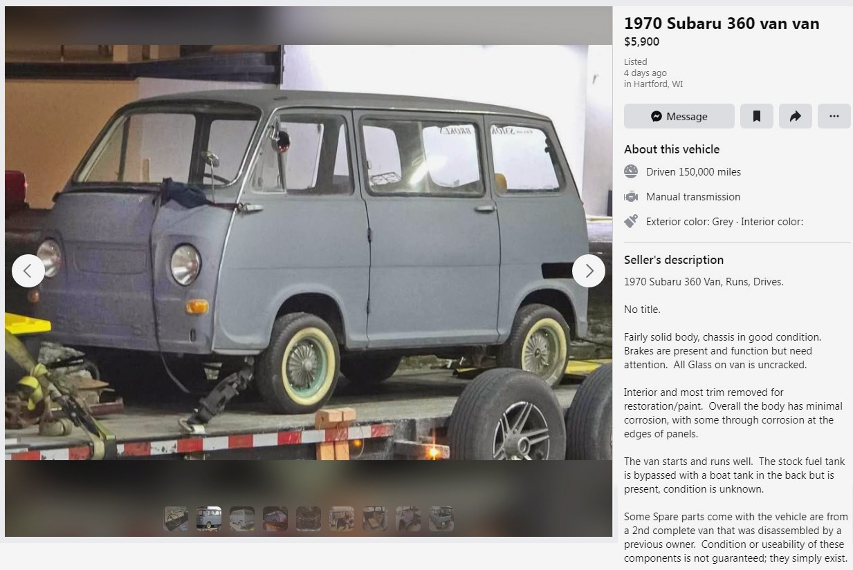 At just under 10 feet long, just over 4 feet wide, and weighing just 1,180 pounds, you could say this is a small van. Small vehicles are a-ok in my world, and these vans don’t come up for sale too often. This 1970 Subaru Sambar Van is posted here on Facebook Marketplace in Hartford, Wisconsin, and the seller is asking $5,900. Here is the original listing, and thanks to NW Iowa Kevin for the tip!