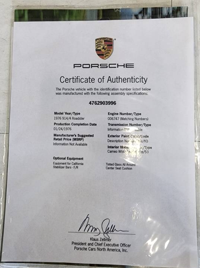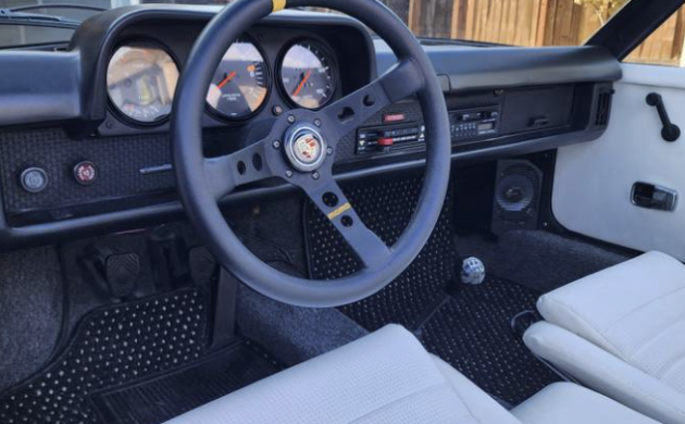 If you are 6’1″ tall, don’t worry – this is a sports car you can drive. It’s low, but once you’re in, leg room is generous. The cabin is wide, too – about 1.5″ wider than a 911. Its wheelbase is longer than its more expensive sibling, but thanks to minimal overhangs front and rear, its overall length is 7″ shorter. With the engine directly behind you, the weight distribution is balanced at 50/50: 914s are renowned for handling like they’re on rails. Drive a 914 through an autocross, and you’ll smile all the way to the podium. The seller notes that all gauges and lights work, and the roof panel is in great condition (which we hope means – no leaks). The trunk is clean and still contains the spare. A COA from Porsche signals that its ownership history includes at least one enthusiast.