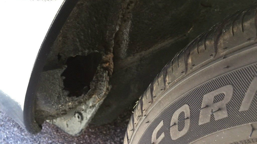 There are several rust spots in the wheel wells like this–kudos to the seller for being honest and showing them.