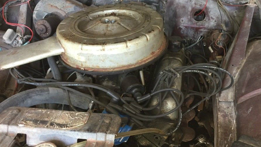 The 215 cubic inch V8 is connected to a two-speed automatic. Both leak at the moment. The seller is including a later model 700R4 transmission that they say can be adapted to this engine, but I was unable to find any automatic adapters at the website they mention (although there were plenty of manual transmission adapters available). Anyone know if the two-speed in there now is worth rebuilding? And are you interested in this longroof?