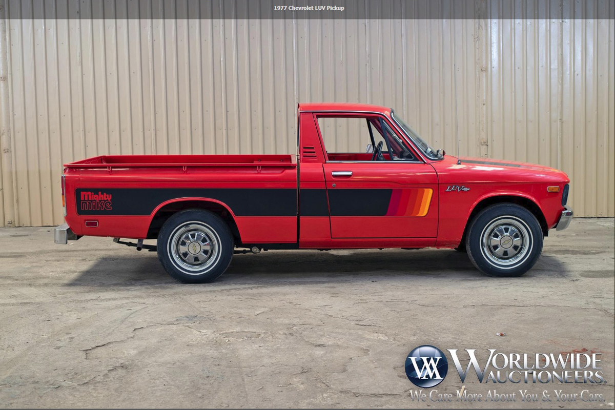 We have seen a few Chevy LUVs here over the last few years but I have never seen this model. This is a 1977 Chevrolet LUV with both the Mikado and Mighty Mike packages. This one is going to be auctioned off, as you can tell from the info on each photo. The Texas Classic Auction on April 21st is where and when this one will cross the block with no reserve. Thanks to Marcus for sending in this tip!