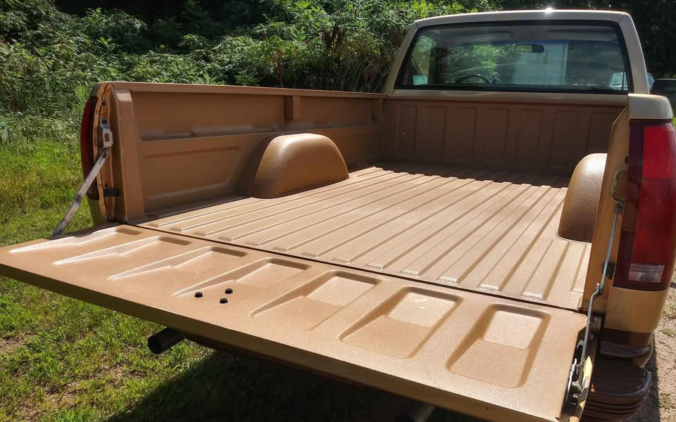 I’m not sure if I’ve seen bumpers and the grille painted like this, but I like it. A lot. No, I love it. The boy-racer straight exhaust pipes, not so much, I’d knock that back a bit, but that’s just me. Again, it’s more than just looks; I tend to hit my shins on things like that, so that wouldn’t work at all for me. The seller is listing this gorgeous truck for a friend, and they listed a phone number to give a jingle for more info. Disclaimer: I took most of the phone number out of the “original listing” link, so six months from now, he’s not getting calls. Inside the bed looks fantastic. It appears to have been lined and then sprayed body color, or something similar. I don’t know how this truck could look any nicer than it does. I’d prefer it to have its factory badges, but that’s just me. I’m not a big de-badged guy.