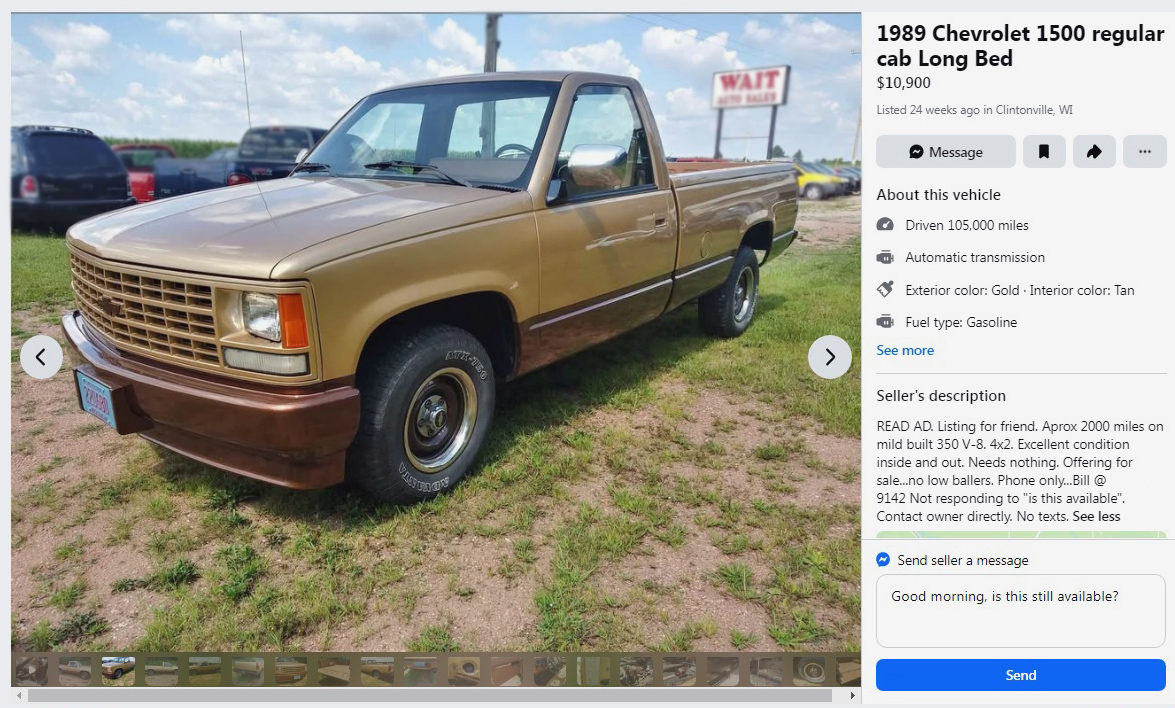 I’m not sure if I’ve ever heard a pickup owner describe their truck as “superlative,” but that’s what Chevy calls their full-sized pickup lineup for 1989 in this brochure. This 1989 Chevrolet C1500 pickup can be found here on Facebook Marketplace in Clintonville, WI, and the seller is asking $10,900. Here is the original listing, and thanks to Lothar… of the Hill People for the tip!