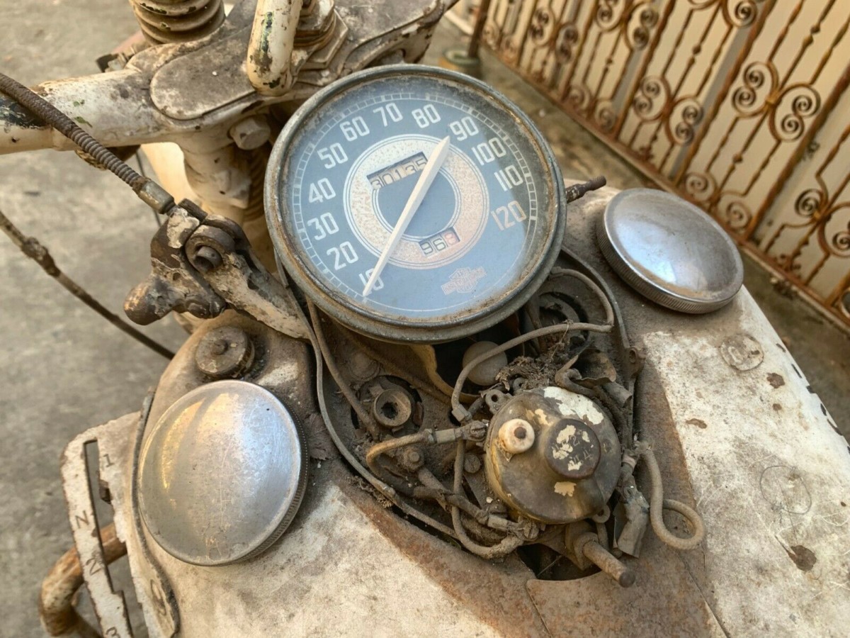 The flathead has been part of a museum exhibit up until recently, and is only for sale in order to create more room for future exhibitions. Despite its relatively complete appearance, some parts have gone missing and likely been missing for years. These parts include the carburetor, fuel line, exhaust header pipe, headlight, horn, and a few other items. The Harley does come with some rare parts still attached, including the military-grade ignition switch and speedometer, oil bath air cleaner, crash guards, and speedster-style handlebars. Despite the missing parts, the engine still turns over.