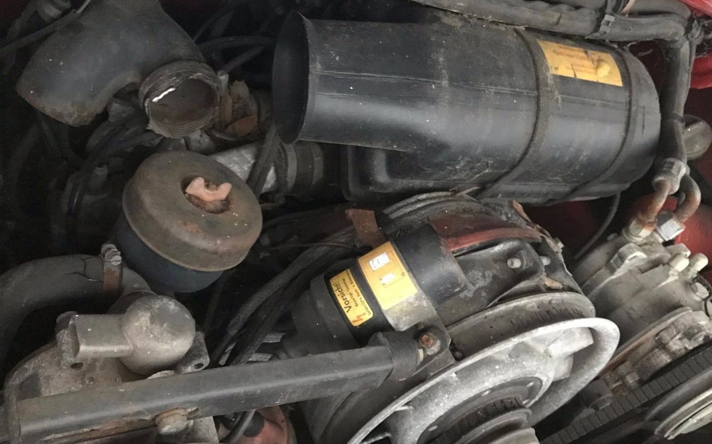 EU cars had smaller rear bumper biscuits and this car has them. It has E stickers where a US car would have something else.I think it is a ROW car. They had a bit more power. I see the flaking paint on the rear lid and some cracked wiring or smog air hose. Maybe.it was hot. the rest of the engine parts do not look so bad. The rust would be a negative, but also for other bidders. I don’t think it is so bad. The seat is ugly. Mileage is very low. That car is a bargain at $12-14k.