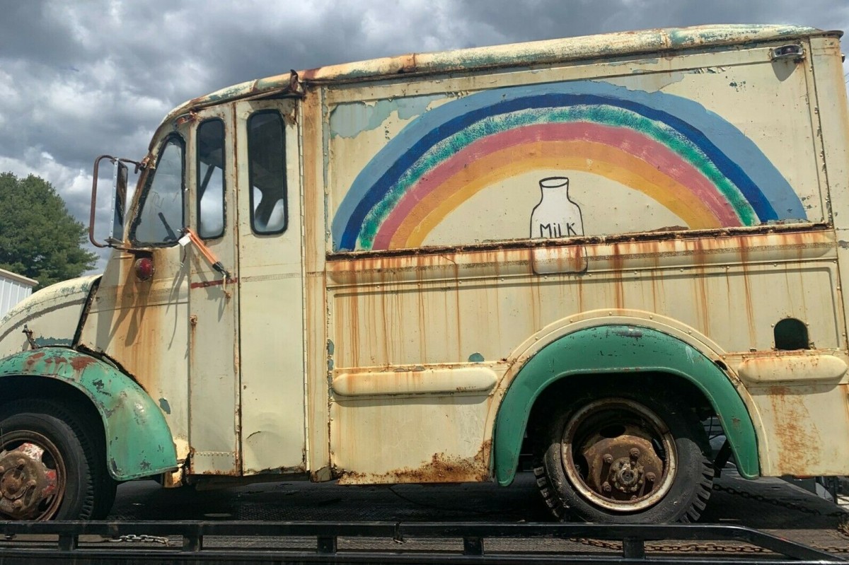 Mostly visible on the sides of the seller’s truck, there is a “Rainbow Dairy” logo present from when it was in service. Its shape closely resembles that of today’s Rainbow Milk, a Middle Eastern company that also produces dairy products, but we’re unsure if there’s any connection. We’re told the truck is largely complete and was acquired as a 1950 model, but there is no title to back that up and the manufacturing plate is difficult to read. Restoring this truck will not be an easy project.