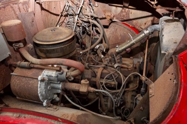 The real question is, what direction would you go with this truck? You have to consider how you will be driving this truck when you finish it. Milk trucks usually never left the city limits of the town they delivered milk in. They were geared to move from house to house and neighborhood to neighborhood efficiently. Highway speeds were often impossible. If you tried, the motor would be screaming at less than sixty miles per hour. So, you have to decide if the original engine, seen above, would stay or go. If you planned on driving it anywhere other than very local events, then a power plant swap would be in order. If in town or trailering is your thing, then the original engine looks complete. However, I’d bet you’d need to at least refresh it inside with new rings, bearings, and oil seals. You may have a problem finding these components, as I don’t recognize the flat head inline six sitting there. Maybe it is a Continental? Also, what is that pump looking device bolted to the inner fender?