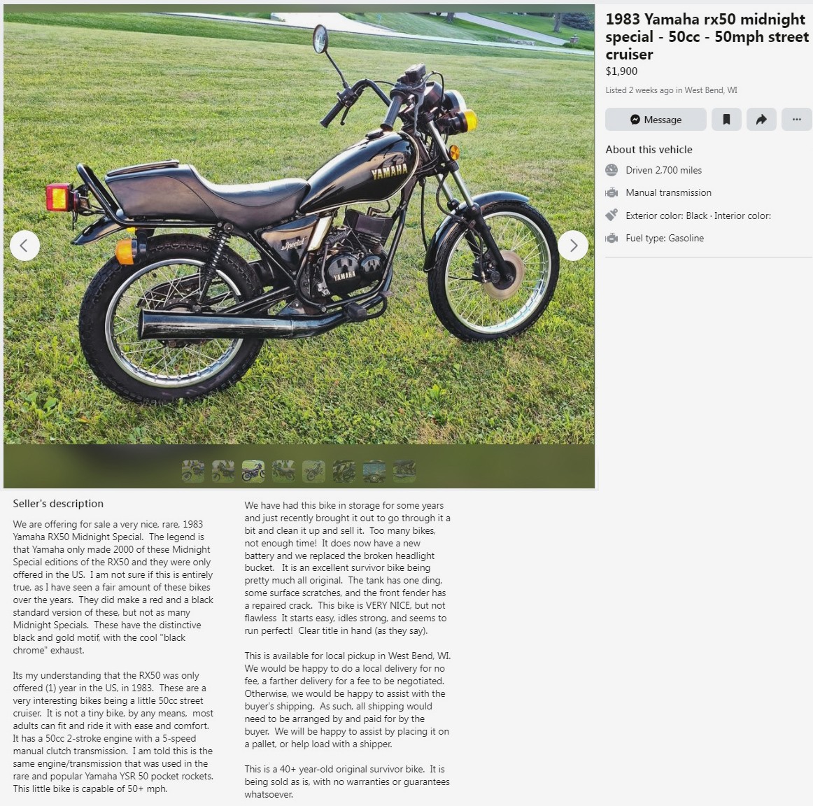 When a 1200-cc Yamaha is just too much, or a 920, 900, 750, 650, 500, 400, 250, 125, or even an 80-cc bike won’t do, we offer you this mini Midnight Special-like 1983 Yamaha RX50! This incredible and incredibly rare cruiser bike is listed here on Facebook Marketplace in West Bend, Wisconsin, and the seller is asking $1,900. Here is the original listing, and thanks to the man, the myth, the legend: Lothar of the Hill People, for the tip!