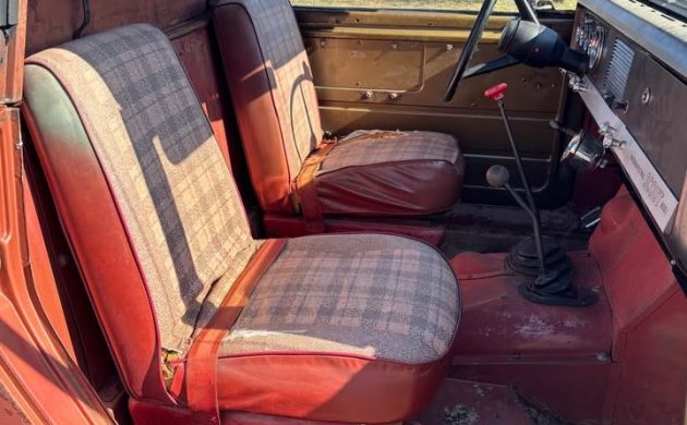 International Harvester Scout 80s (1960–1965) featured a 152 cu in inline-four engine with 93 horsepower as standard. This engine was also offered in the Scout 800 but could be ordered with a turbocharger. The Scout 800 could also be ordered with a 304 cu in V8, while other available engines in 1970 included a 196 cu in inline-four and the 232 cu in six-cylinder. Some literature states that a 345 cu in V8 and a 392 cu in V8 was also options, although I have not been able to verify this. In the mid-1970s, Scout II models (1976–1979) continued to receive upgrades like nicer interiors and other special versions. The interior of this Scout 800A looks factory and is fairly worn and rough. The engine is backed by a manual transmission.