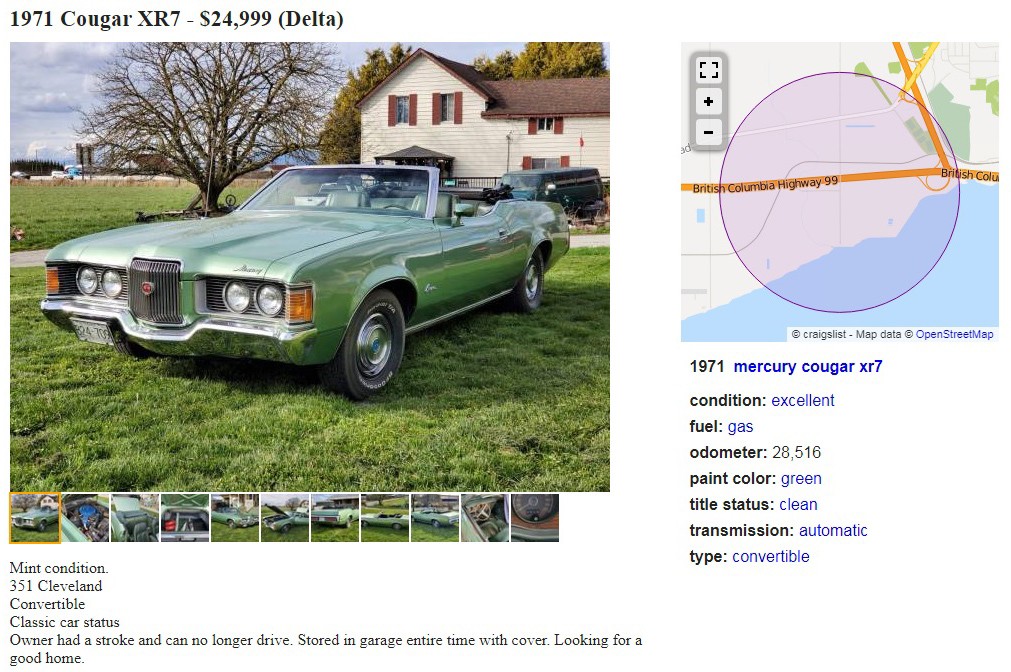 One of my fears is someday having a medical issue that’ll keep me from enjoying my oddball collection of oddball vehicles. It happens more often than you may think, and that’s supposedly the case with this “mint condition” 1971 Mercury Cougar XR-7 Convertible. The seller has it posted here on craigslist in Delta, British Columbia, Canada, and they’re asking $24,999. I’m assuming those are Canadian dollars. Here is the original listing, and thanks to Curvette for the tip!