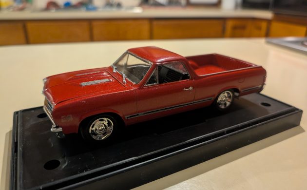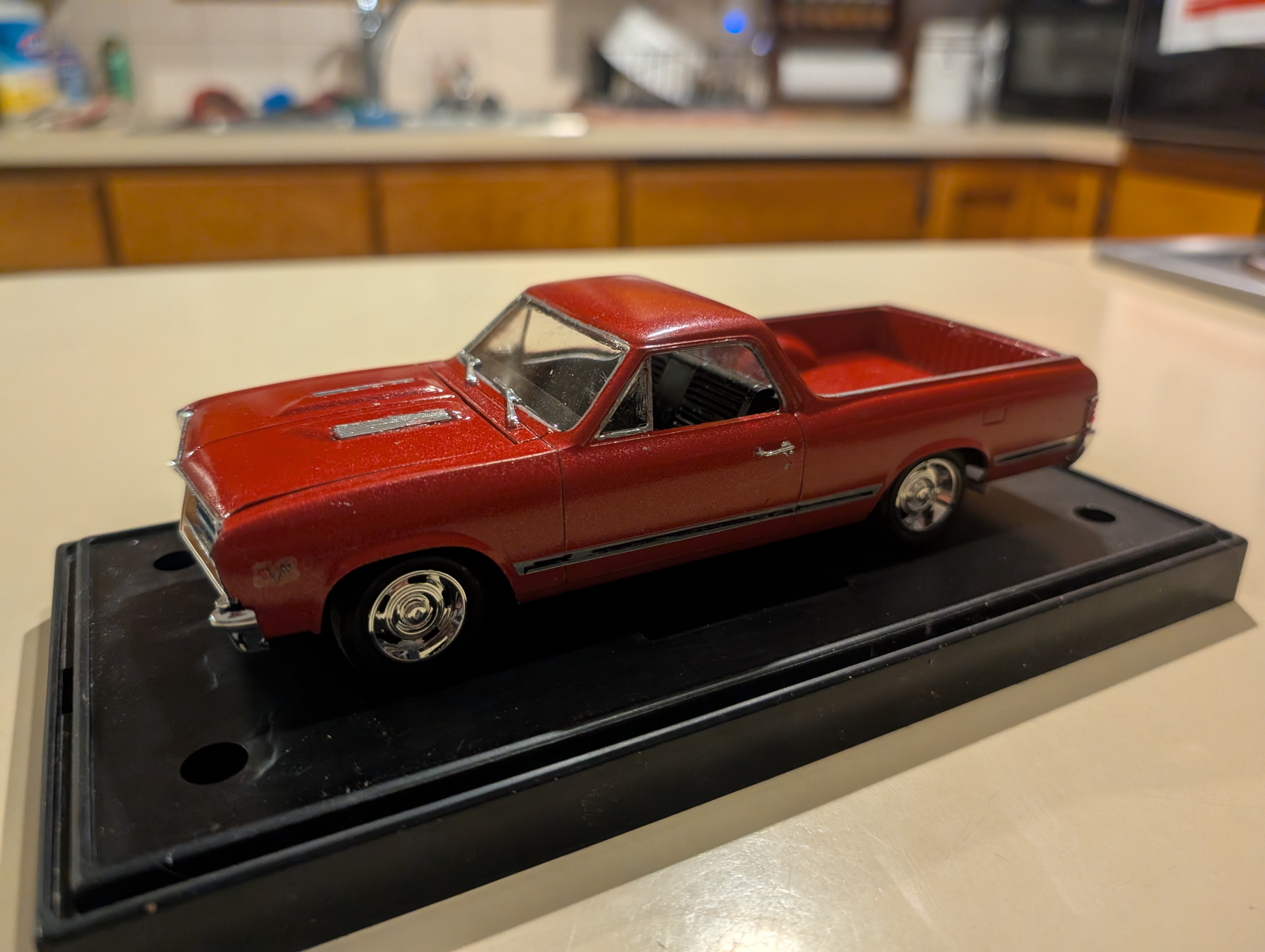 It’s a sickness. I “helped” my older brother with his models in the early 1960s and inherited many of them when he went into the Air Force in 1964. I continued buying and building them through all these years. Luckily, my mom didn’t throw them out when I went to college and I retrieved several boxes when we bought a home of our own. I slowed down over the years – jobs and kids have a pesky way of taking up time and money. I’ve gotten back into it since retirement. Our farmhouse is about 150 years old and has a cellar instead of a basement but I made a little shop down there. On a day like today when it was 14 degrees below 0 I can just go down and play a little. My older brother is still one of my heros so this year I made a 67 ElCamino to match his original paint/engine/interior red 396 ElCamino. They don’t make a 67 model, but they do make a 66 ElCamino and a 67 SS 396 so I cut the front off each and made a 67. I painted and detailed it to match and gave it to him for Christmas. He was almost as excited as I was.