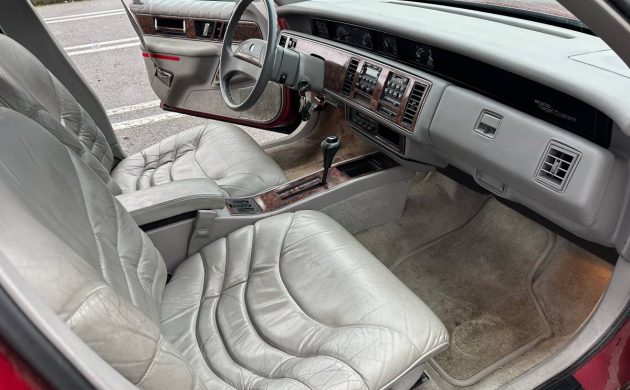 Inside, there was still plenty of luxury despite the downsizing occurring elsewhere. The leather seats are in fair shape for a car of this age and with over 100,000 miles, suggesting that it was looked after while still serving as a dutiful daily driver. The dashboard shows no cracks, but that generally wasn’t an issue with these 90s-era domestics; the Germans had far more issues keeping the dash pad from splitting into pieces. The Buick is loaded with all the power and convenience features you could ask for, but this one pre-dates the standard airbag. The carpets show some stains, but hopefully that can be remedied with some carpet cleaner. The fake wood on the dash and door panels still presents well.