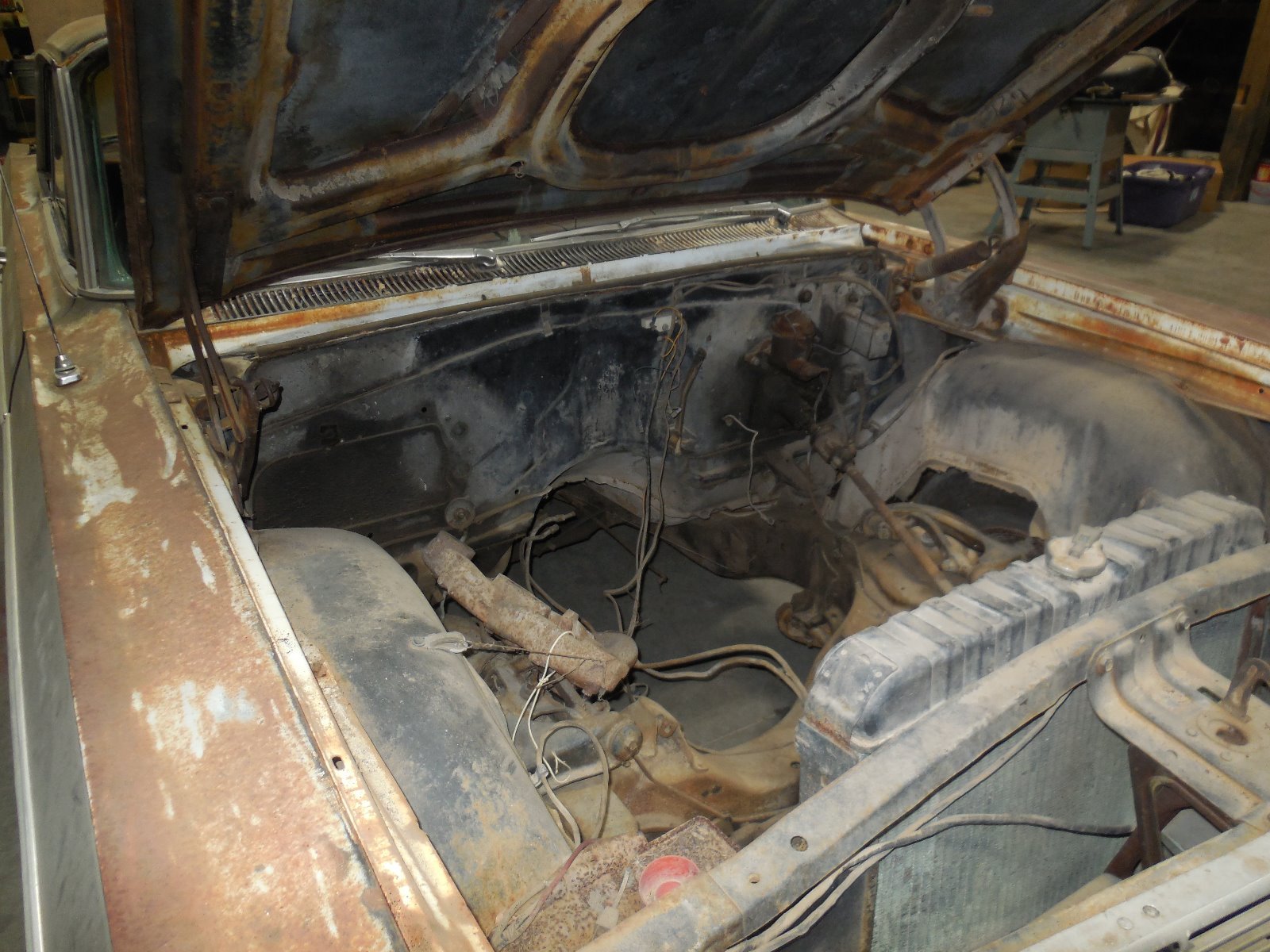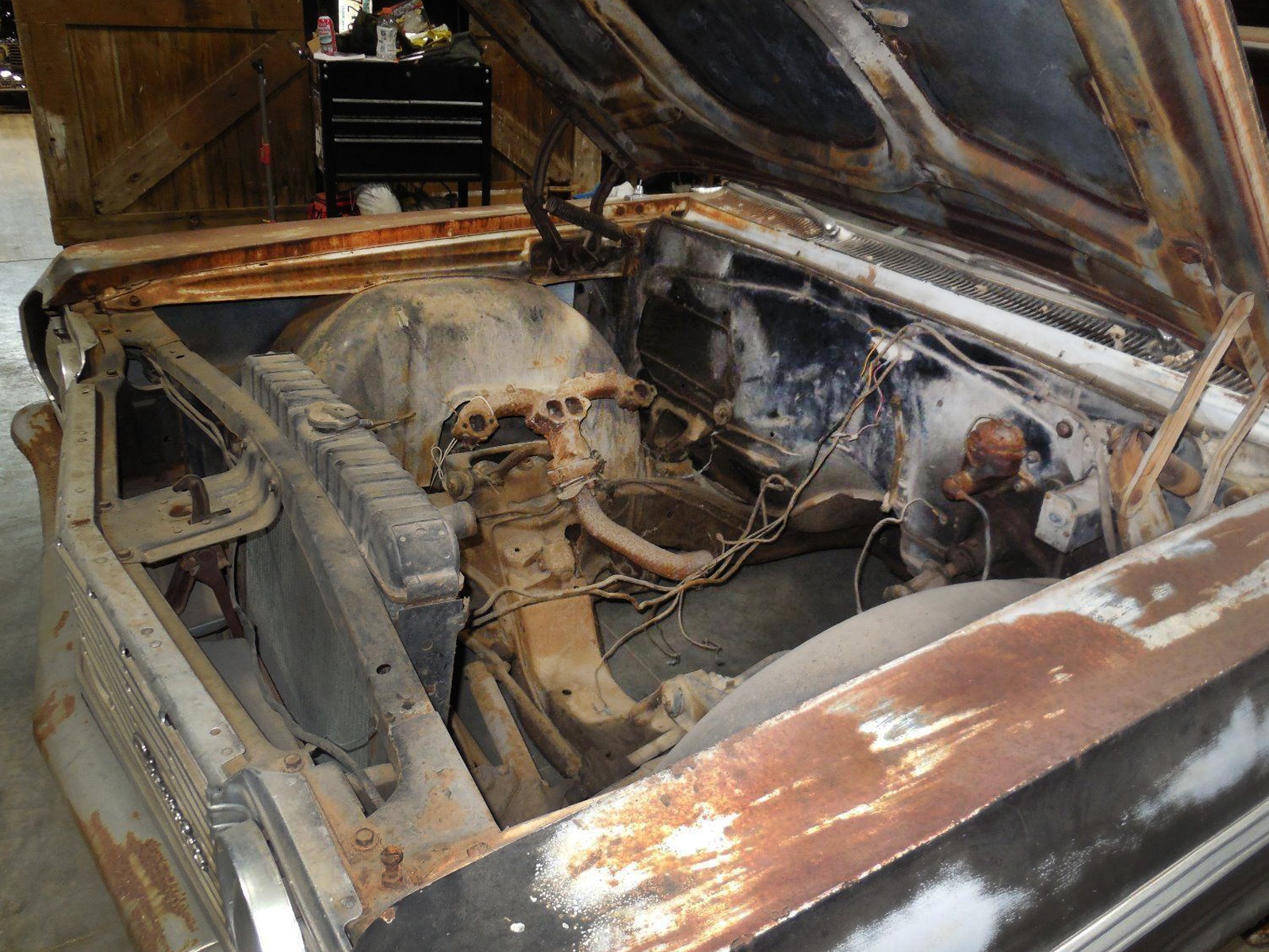 More positive notes here, the interior looks much nicer than the body does. You can see the cracks on the dash and a lot of things that “need replaced”, as the kids say in 2017. Those cord-velour-like seats don’t look original, but the seats do look good front and rear. The carpet had to have been replaced at some point. The next owner will most likely strip this thing like (insert un-pc phrase here) and totally redo the interior anyway, after fixing and coating the floor and putting down some Dynamat. You can see that there is an automatic transmission – that was originally a two-speed-slip-and-slide, or officially, a Powerglide, which is sitting in the trunk. The rustier-than-what-I-would-have-thought-an-Arizona-trunk-would-look-like trunk.