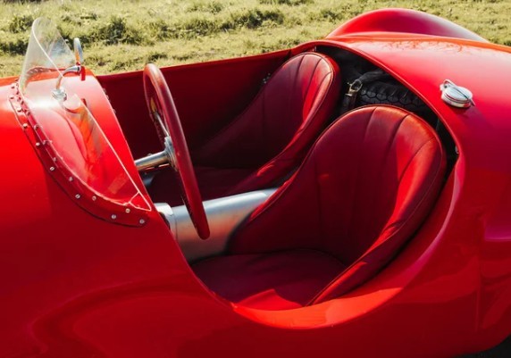The interior is like a slipper, everything close at hand – including the fuel tank behind the driver’s head, nestled next to a spare tire – all in the rear cavity. Only the passenger is given a door, and the cut-down plexi windshield offers the barest of protection from wind. There is no weather equipment – this is, after all, a race car. A machine-turned instrument panel cradles three gauges including a Jaeger tach – the only important one. A glance in the single rear view mirror is your one chance to find out what’s on your tail.