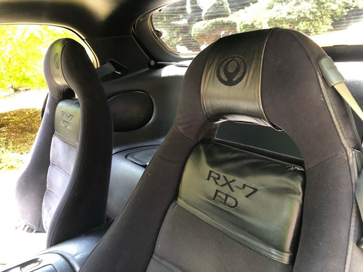 The interior sports a modification I can’t recall seeing done previously, which is effectively that of wrapping the suede seats with embroidered patches…or something. I can’t quite tell, but the end result seems a bit cheesy to me. The seller reports that the Mazda will come with the JDM-spec wheels it currently rides on, but he’ll include the stock wheels as well. As an R1 model, the RX-7 left the factory with firmer suspension, Bilstein shocks, an engine oil cooler, and the suede bucket seats you see here. There was also a front chin spoiler and rear air dam, both of which are accounted for here.