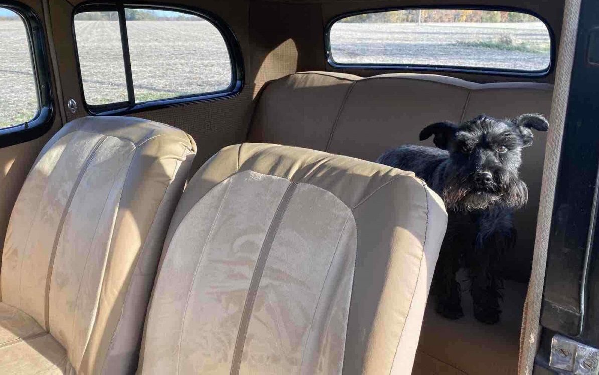 The interior is in keeping with the exterior, it’s quite nice but I’m not certain that the front seat covers/upholstery are keeping with an originality theme. The material pattern does not look like standard fare for the ’30s. The headliner, what can be spied, seems to be in great nick too. Don’t know about Rover however, he looks a bit chuffed about something.