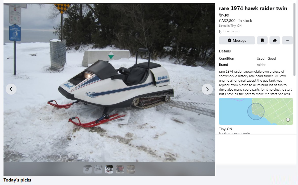 In Raider’s second-to-last year making snowmobiles, the company found itself using up leftover parts for the 1974 model year. The base model Hawk came along in 1974, and they had no shocks on the skis, so this one must have been upgraded by a former owner. This 1974 Raider Hawk twin-track snowmobile can be found here on Facebook Marketplace in beautiful Tiny, Ontario, Canada, and the seller is asking $2,800 ($2,030 U.S. dollars). Here is the original listing, and thanks to Lothar… of the Hill People for the tip!