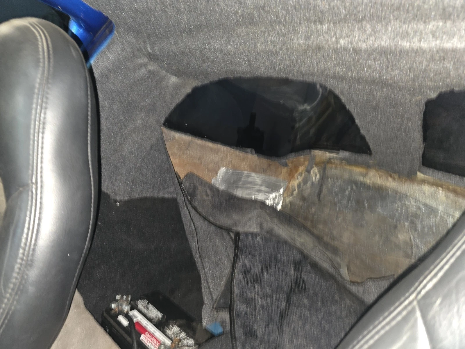 Inside, the interior’s components consist of a combination of older and newer parts, featuring the instruments from a ’96 model surrounded by a C2 dash on top. Most of the panel covering is a gray material, possibly trimmed with hand scissors, and falling in the back. It would be nice to get to view everything that is hiding beneath all of that fabric, but the unusual battery location is certainly no mystery.