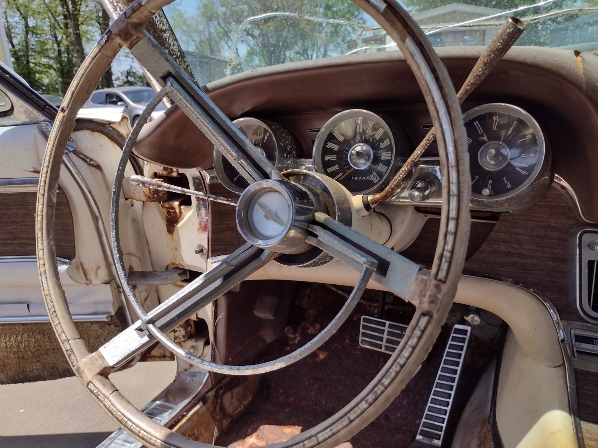 Talk about “high water mark”, I don’t think I’ve ever seen a column shifter rust like that. The T-bird/Corvette debate goes on and on, like what was the 1st muscle car. I read, and always thought, while the T-bird was initially a 2 seat roadster, it almost immediately catered to a more upscale market. Corvette was in your face, brute hp, while the T-bird had that, but a bit more class. Of course, in ’58, T-bird practically abandoned the sports car concept, while Corvette stayed true. This is what’s called an ” ambitious restoration”, and not sure what kind of market there is for this anymore.