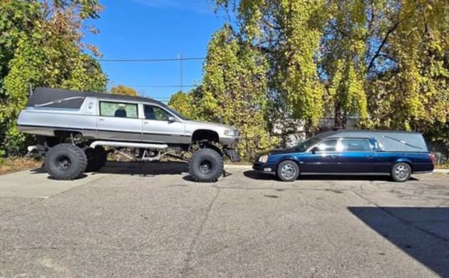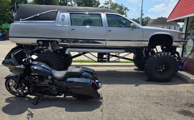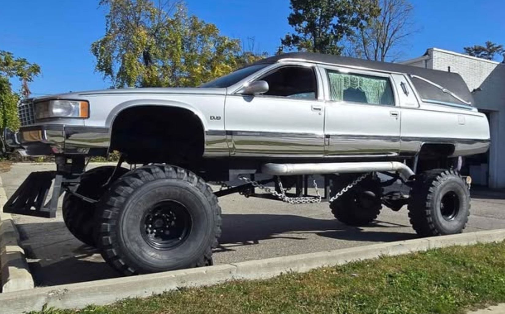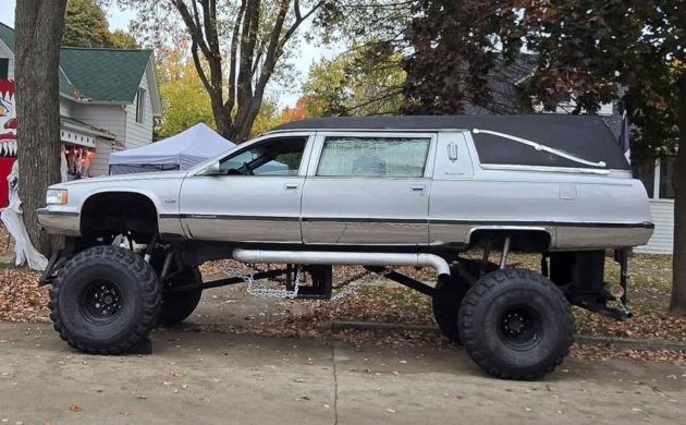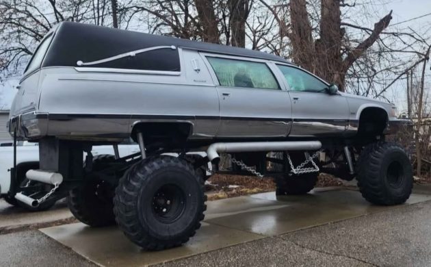 Up for grabs out of Mt. Clemens, Michigan, is a custom-built 4×4 hearse that’s equal parts wild and wonderful. Listed here on Facebook Marketplace, this creation started life as a 1995 Cadillac hearse but now rides on the rugged underpinnings of a 1979 Ford F-250. The seller says it runs and drives, though it still needs some finishing touches. It’s currently sitting on a set of massive 44-inch mud tires and powered by its original Cadillac 350 V8 engine. Thanks for the tip Ted!