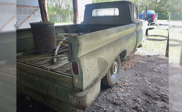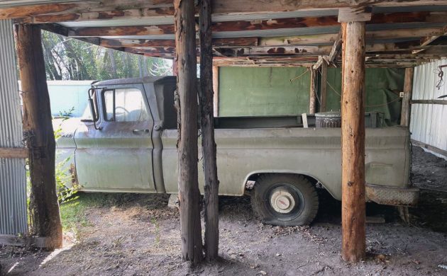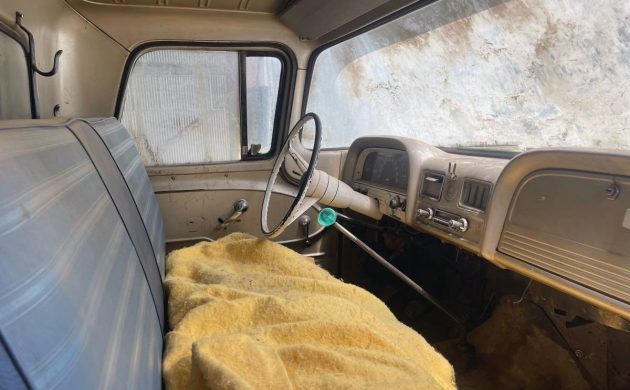 The only real issue I see with this truck is that it appears to have either taken a hit in the back end or backed into something. Both sides of the rear bed have dents as if the rear bumper has been pushed in. I’d want to check that out for any possible frame damage; it sure pushed in those sides. That’s not impossible to fix, but you’re not going to slather 4″ of bondo on those dents, I hope. It isn’t running, of course, or the seller would have driven it out for better photos, but despite that, they have provided pretty good photos for a truck sitting in a lean-to.