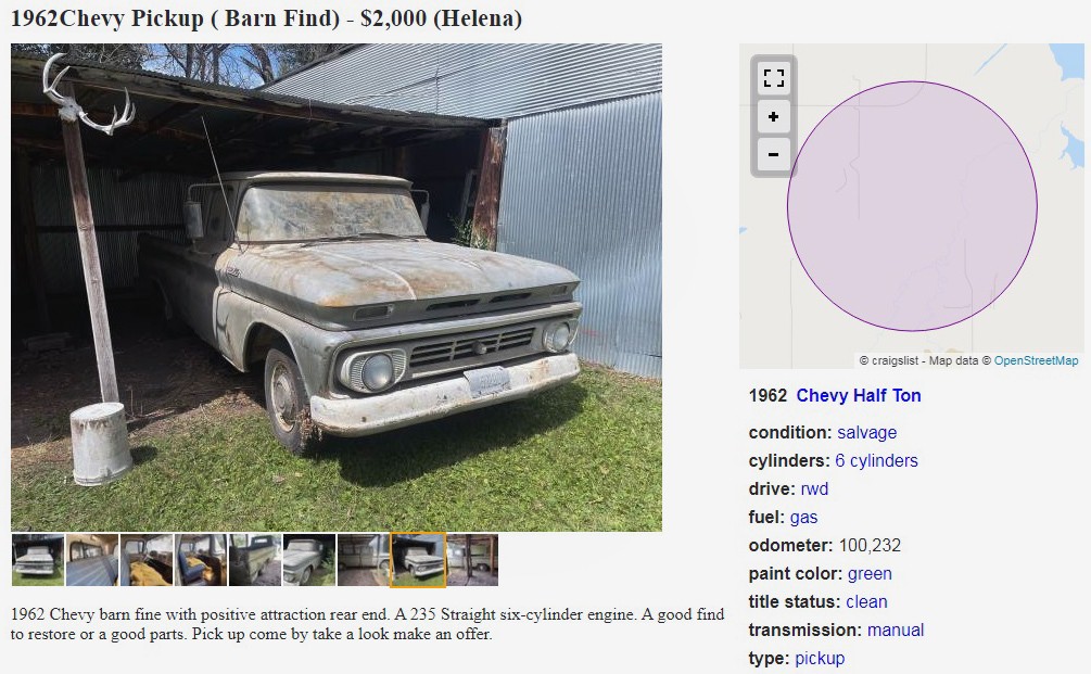 Now that’s a Barn Finds-looking photo! We hit all genres here, as you know, and a lot of vehicles aren’t shown sticking halfway out of a lean-to or a barn somewhere, all covered in dust. This 1962 Chevrolet C-10 Fleetside is one that is an actual barn find, and this truck looks pretty nice, despite the dust. The seller has it posted here on craigslist in the capital city of the great state of Montana: Helena, and they’re asking $2,000. Here is the original listing.