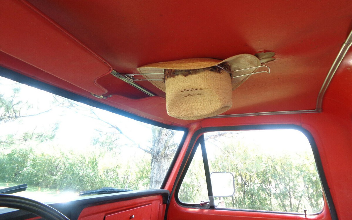 A cowboy hat holder that’s attached to the headliner! I wear a nice Stetson straw hat in the summer when I’m out for photos (it’s “straw hat season” in the summer, as they say here in the Midwest) and I just keep it lying on the seat. Invariably, when my wife gets in, she tosses it into the backseat! Arrghh.. not anymore. Speaking of the seat, the original seat is in the back, the one shown in the cab is a replacement due to it wearing out from use. This truck was used to move irrigation systems around with lots of getting in and out of the driver’s seat over the decades.