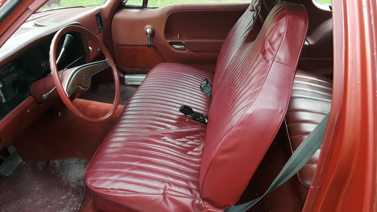 Very red and 70’s the interior of this Pacer shows rather nicely, with some varying fade throughout. The front bench has been recovered with a slip cover. The dash and door panels show the mild fade, but for the age of the car, I think it has aged nicely. A bit rough looking, the driver floor mat looks to have seen better days, and I am uncertain if it is a factory piece. Install a nice set of mats, and enjoy this interior as is.