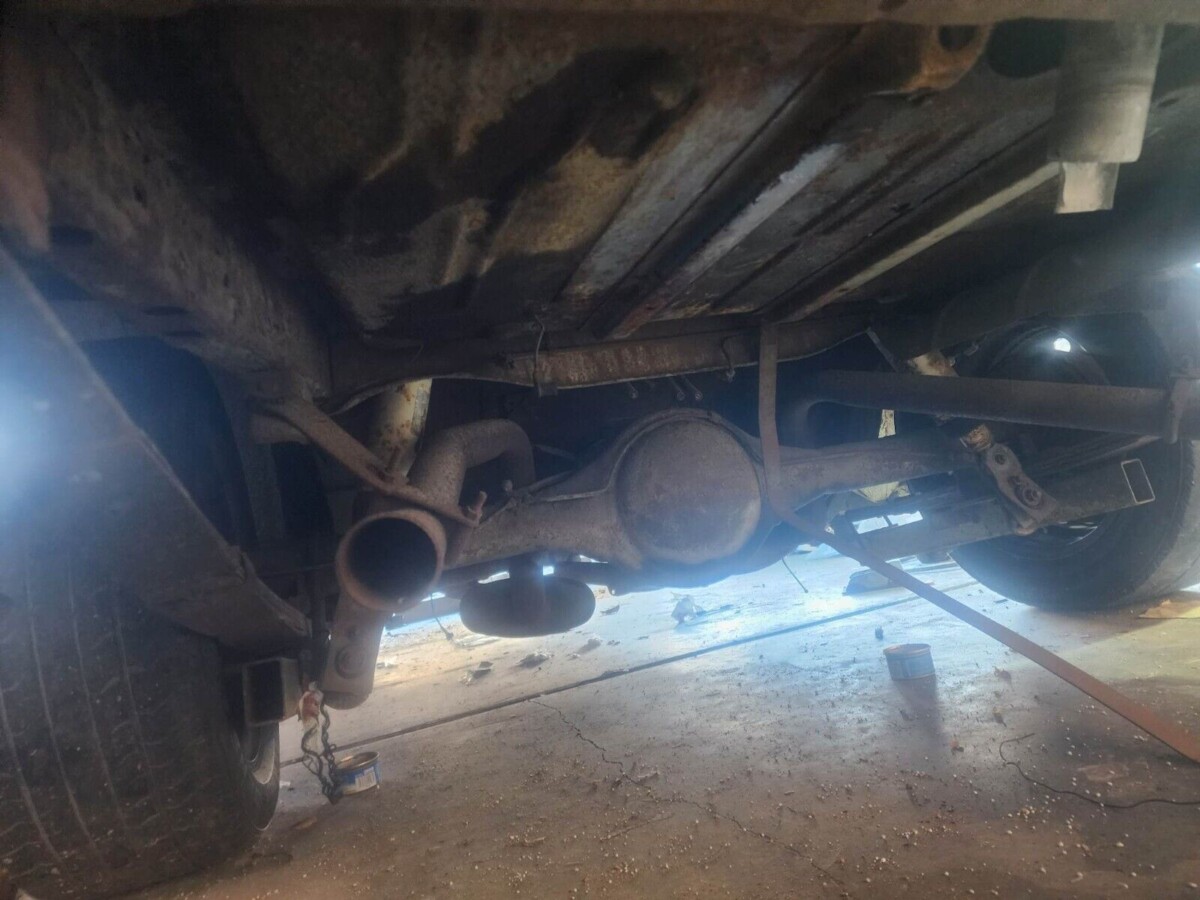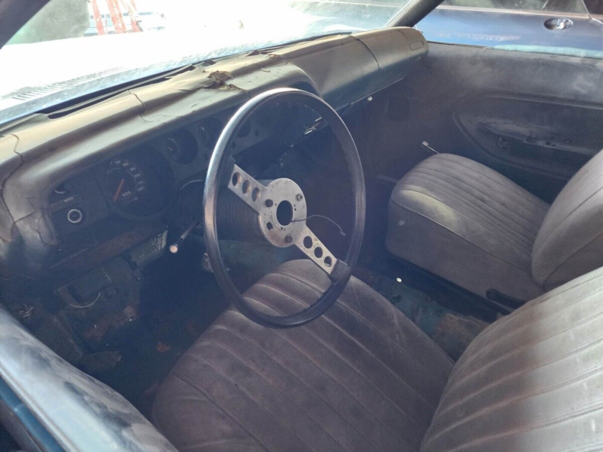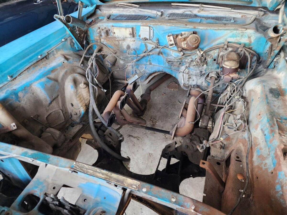 At the moment, the engine bay has that empty feeling. This car’s original powerplant was the base 318 cu. in. V8 but the seller will include a running 360 cu. in., which was offered in late 1973 and 1974 from the factory. The original transmission was a four-speed manual; the seller is offering up his small block 727 Torqueflite automatic with the sale. The rear end is an 8 3/4 with a 489 case. The driveshaft, radiator, and exhaust are with the car.