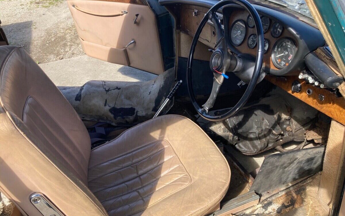The interior could be best described as ratty. The tan leather upholstery is not bad but the woodwork is worn, the carpet is missing, as is the horn button/switch, and there is miscellaneous exposed wiring. The Smiths gauges, however, look to be clear. One interesting facet of this car, perhaps owing to its Mopar powertrain, is the pushbutton transmission activation (far right). This feature was discontinued with the introduction of the Mark II.