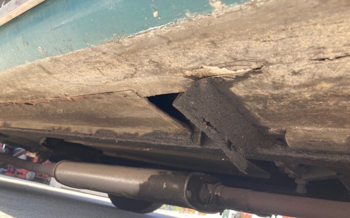 The seller tells us, “Car won 2nd plc in Morgan Hill British car show with Bristol cream sherry bottle in fuel filler neck 2018“. It’s tough to imagine this car winning anything other than a tow notice if it were parked on a public street for too long a time. The finish is just peeling away but the underlying aluminum skin seems to be pretty straight. And from what can be seen, the trim and accessories are still in place, all good news but that exterior presentation is hard on the eyes. As for the underside, I’m not so certain.